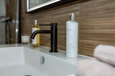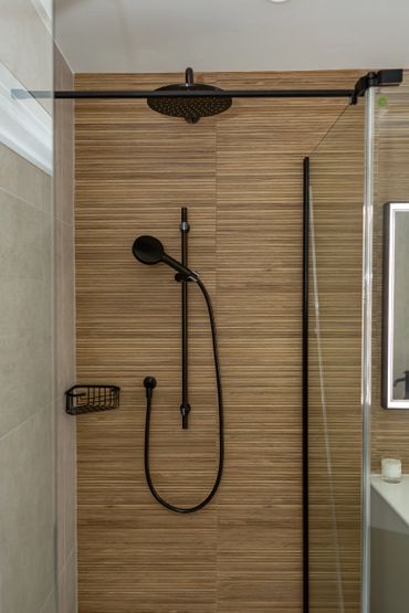 Experience the perfect balance of style and practicality in this beautifully designed family bathroom. Neutral and wood-effect tiles create a warm, inviting ambiance, while sleek black brassware adds a touch of modern elegance.