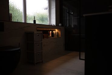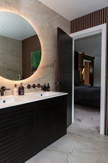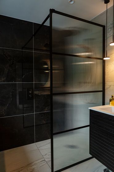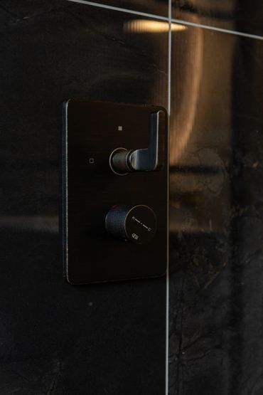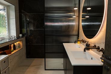 The moody lighting enhances the dramatic contrasts, casting subtle shadows across the space for a deeply immersive experience. Expertly crafted by our in-house fitting team and thoughtfully designed by our interior designers, Shane Tierney from Shane Nicolas Design , this bathroom is a flawless blend of style and function—tailored to offer both comfort and elegance in equal measure.